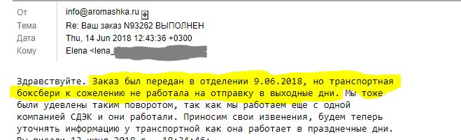 Alёnkа Опубликовано 17 июня, 2018 Share Опубликовано 17 июня, 2018 (изменено) Аромашка, привет! ) Не нашла топика по проблемам с заказом, пишу тут. Помогите, плиз, решить! 08.июня оплачиваю заказ N91072 , и в этот же день он отправляется службой доставки Боксберри в мой город. Этот заказ получен, спасибо все четко. 08 же или накануне на почту приходит ваше новостное письмо с информацией о солнцезащитном средстве SENTIO и глядя на оперативность отправки заказа N91072 я принимаю опрометчивое решение сделать еще один заказ с этим средством. 18.06 семья вылетает в отпуск, очень кстати и, судя по динамике предыдущего заказа я его должна получить до отпуска, край в субботу 16.06. 09.06 новый заказ оформлен, оплачен, и на почту приходит от аромашки письмо об отправке. Вроде все отлично. Но вот уже на следующих день я напряглась, ибо в статусе заказа на сайте Боксберри я не вижу никакого движения, висит статус "передана информация о заказе" и ничего более. В итоге, движение заказа начинается только после праздников 13.06 и до своего отъезда получить я этот заказ не успеваю. Боксберри утверждает, что вы фактически передали заказ только 13го числа. Вы утверждаете, что передали 09, но пункт боксберри не работал на отправку, а вы об этом не знали. Боксберри утверждает, что информировал о том, что отправок 09 числа не будет. Вы вообще молчите уже и на письма не отвечаете В общем, я не хочу препирательств о том, кто прав, кто виноват, кто говорит правду, а кто придумывает оправдания. Я хочу помощи по конкретно этому заказу. Факты таковы что: 1. Заказ на Аромашке оплачен, вы свою выгоду получили 2. Отправка Боксберри оплачена, они тоже свою выгоду получили 3. А вот покупатель похоже ни заказ не получит, ни потраченные ден.средства не вернет. ну и плюс второпях придется что-то солцезащитное покупать, уж что есть в магазине почему? потому что заказ приедет в мой город по информации Боксберрии 19-20 июня, а мы 18 июня утром отчалим на три недели в отпуск. При этом срок хранения заказов в пункте самовывоза Боксберри 1 неделя. Что с заказом будет дальше? Как быть? Что делать? предложите, пожалуйста, решение проблемы. в принципе, мне видится такое решение, как пересылка заказа в город нашего отпуска, благо он в России. Но как это оформить и за чей счет? Изменено 17 июня, 2018 пользователем Alёnkа Ссылка на комментарий Поделиться на другие сайты More sharing options...